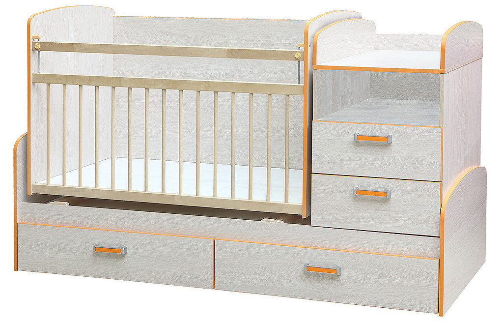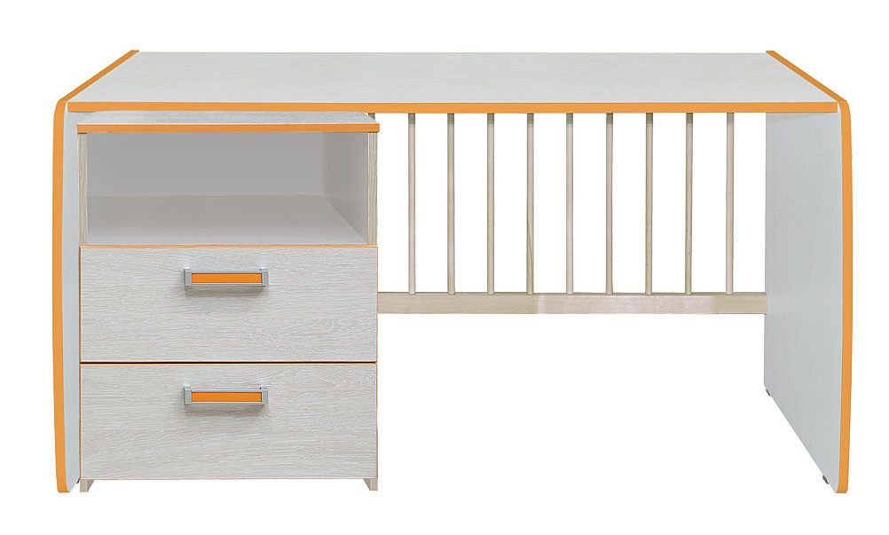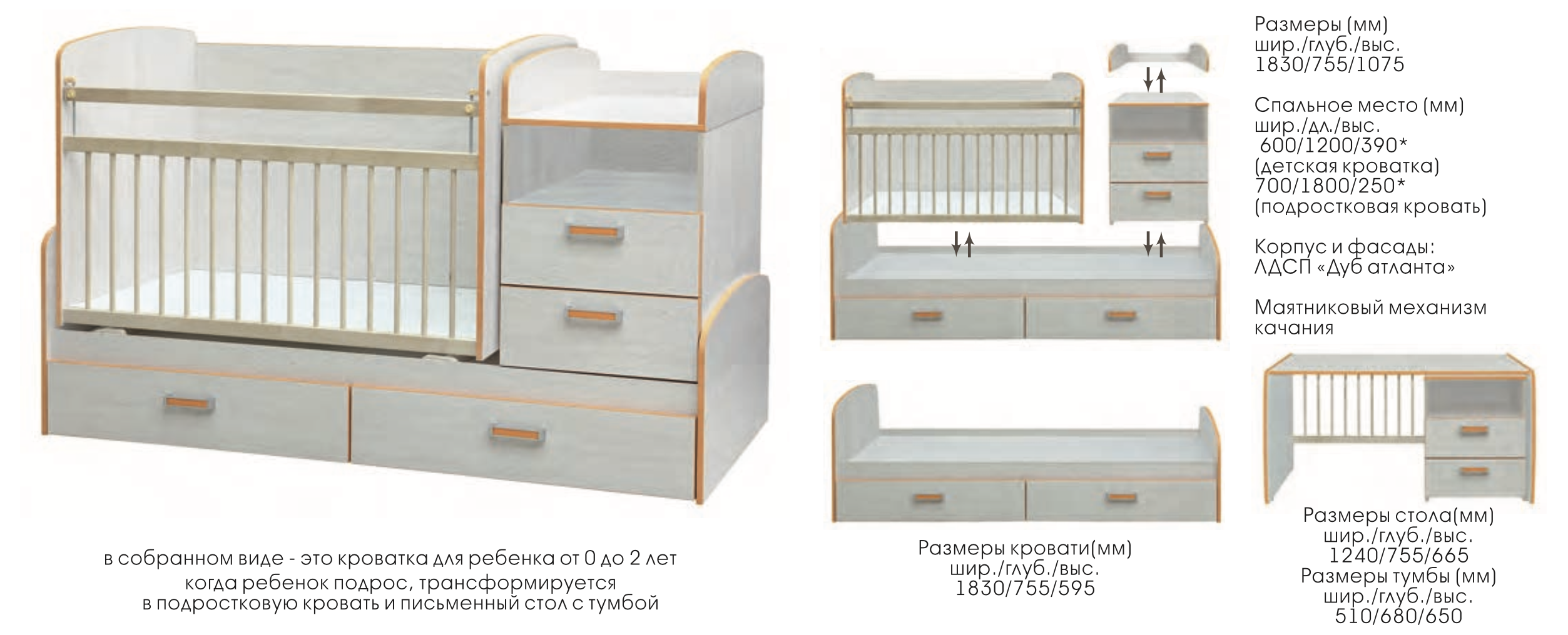 В собранном виде - это кроватка для ребенка от 0 до 2 лет. Когда ребенок подрос, трансформируется в подростковую кровать и письменный стол с тумбой.